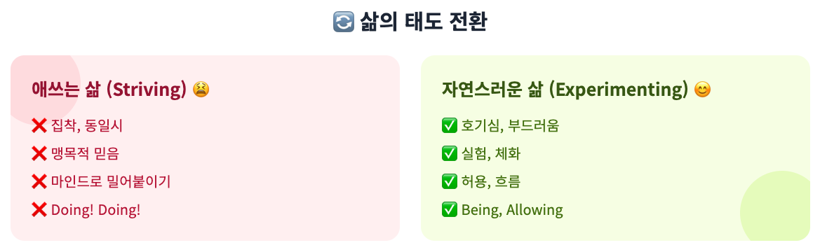 우리가 마인드로 이래야되 저래야되 잣대질, 결정하는 것을 멈추면, 자연스럽게 몸의 역학 존재의 역학에 정렬된다는 이야기에 관한 것이다.