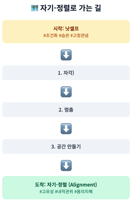 단순히 멈추고, 자각하는 것만으로는 또다시 습관적인 방향으로 나아가기 쉽다. 그래서 권위를 통해서, 자신의 역학에 대한 알아차림을 통해서 자신의 디자인에 정렬되어 가는 과정이 필요하다.